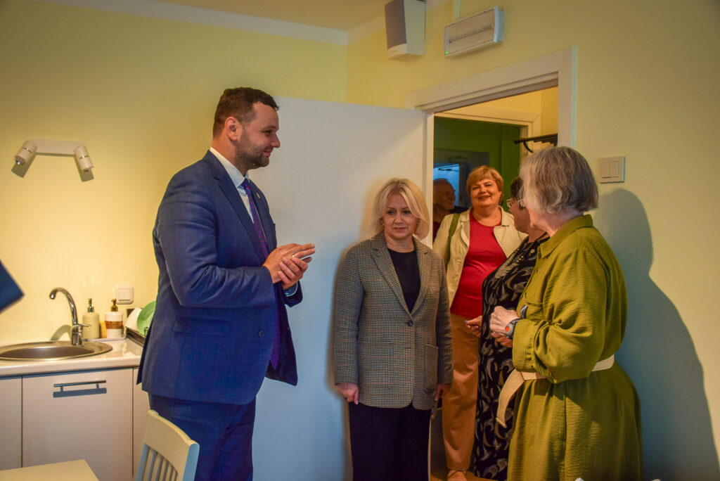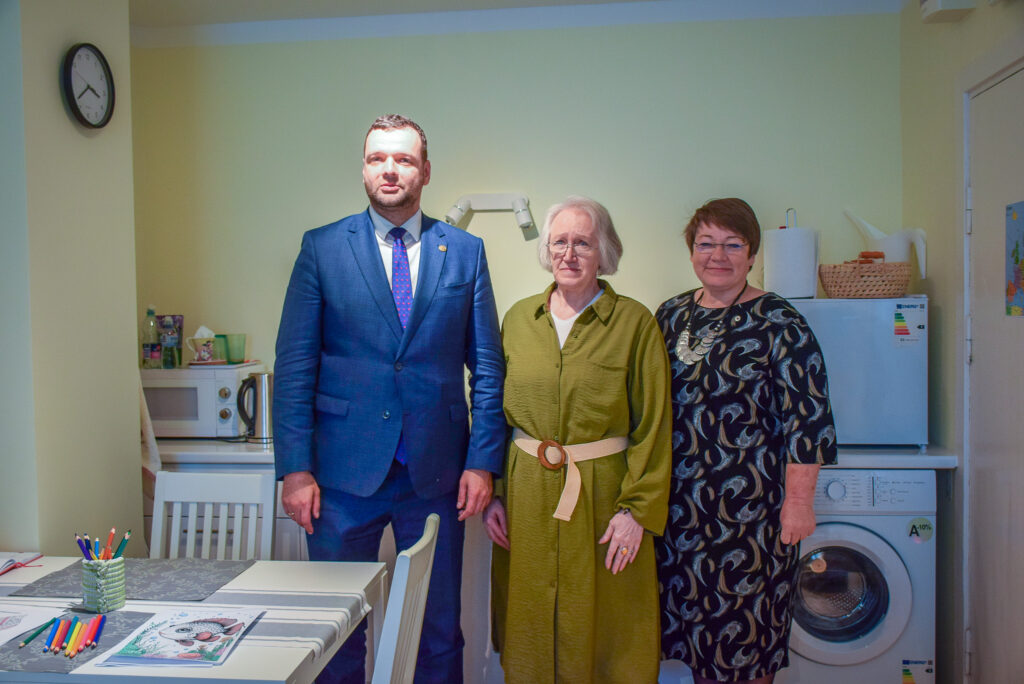 SAC “VECBEBRI” ir ieviests jauns pakalpojums — servisa dzīvoklis, kurā jau ir iemītniece — Velgas kundze. Viņas jaunā apmešanās vieta ir nostāk no citiem SAC pansionāriem, kas liek justies kā savā miteklī. Velgas kundze te jūtas labi un jebkurā brīdī var izsaukt palīdzību, ko nodrošina aproce “Drošības poga”. Labklājības ministrs apciemoja arī Velgas kundzi (vidū).