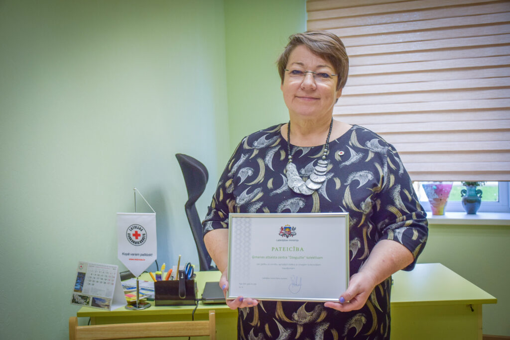 APRŪPES CENTRA “DZEGUZĪTE” DARBINIEKIEM ministrs pasniedza Labklājības ministrijas pateicības rakstu par iejūtību un sirsnību, aprūpējot cilvēkus ar smagiem funkcionāliem traucējumiem. Pansionāru tuvinieki tādā veidā ir novērtējuši personāla nesavtīgo darbu, sniedzot aprūpi, un darījuši to zināmu ministrijai. Attēlā — centra vadītāja Inita Bērzkalna.