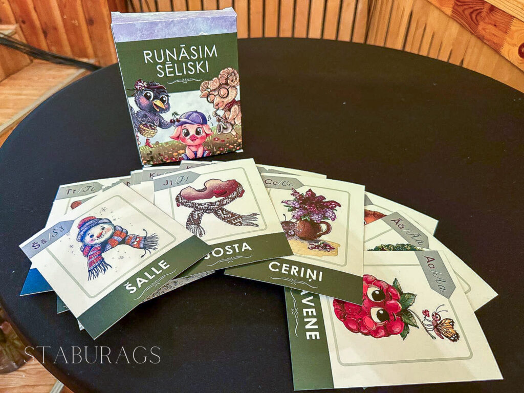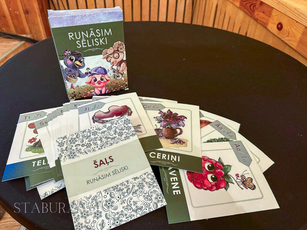 Kartītes veidotas tā, ka vienā pusē ir alfabēta burts un latviskais vārds, otrā pusē – tas pats vārds sēļu izloksnē. Sandra gan atzīst, ka ne katram burtam varēja piemeklēt bērniem pazīstamu vārdu, un uz kartītes ar burtu “ņ” abās pusēs ir “kaķīša dziesma” ņau-ņau. Arī ūpis abās kartītes pusēs ir ūpis. “Taču ir arī ļoti interesanti vārdi, piemēram, ceriņi ir pleiders, avene ir avīkša, žakete ir burnass,” dažus noslēpumus atklāj Sandra un piebilst, ka nav nemaz tik daudz vārdu, ko izvēlēties – kas būtu labi saprotami bērniem. “Kopienu sadarbības tīkla “Sēlijas salas” mājaslapā ir sadaļa “Sēļu mēle”, dažus vārdus ņēmām no turienes. Braucām uz Bebreni pie folkloras kopas “Ritam” teicējām, arī viņas mums ieteica dažus vārdus. Sarunās ar tie, kas pārzina sēļu valodu, šie vārdi izkristalizējās, iezīmējās,” stāsta Sandra.