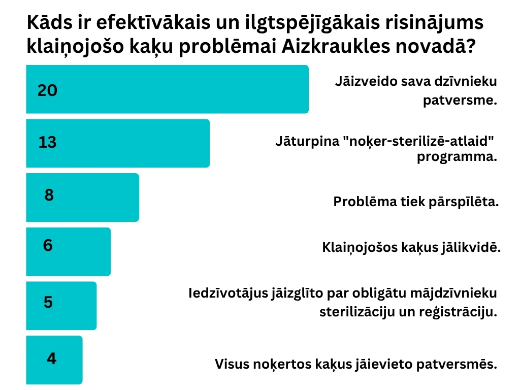 Kā galvenie risinājumi tiek minēta sterilizācija un reģistrācija. V. Stašāne atzīst, ka, lai arī laukos situācija vēsturiski bijusi sliktāka, tagad arī tur cilvēki aktīvi sterilizē kaķenes. ‘‘Tā ir operācija, kas ir izplatīta un pieejama, un tiek veikta daudz biežāk nekā pirms pieciem vai desmit gadiem,’’ viņa saka. Šajā darbā iesaistās arī biedrība “Par ķepām”, tās brīvprātīgā Skaidrīte ķer bezsaimnieka kaķus, un “Jēkabpils pakalpojumi” sedz to sterilizācijas izmaksas. Viņa atzīst, ka kaķu skaits ir samazinājies, lai gan problēmzonas, piemēram, “Dolomīta” vasarnīcās, joprojām pastāv.