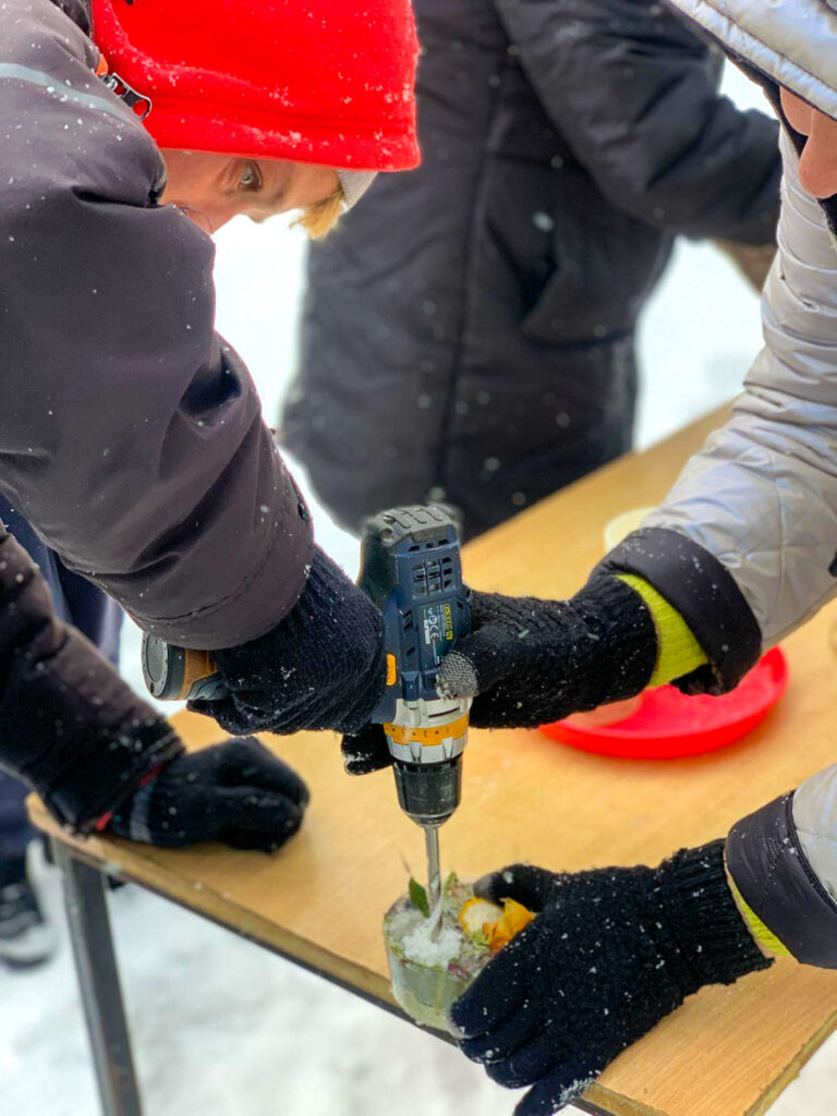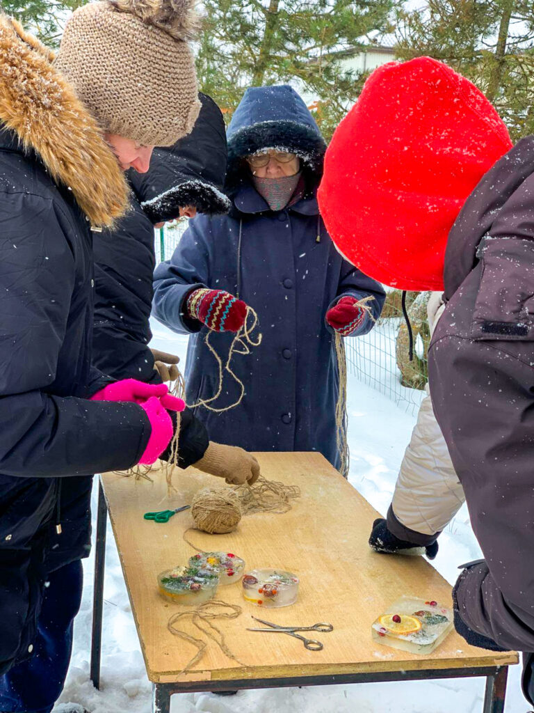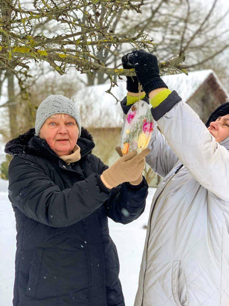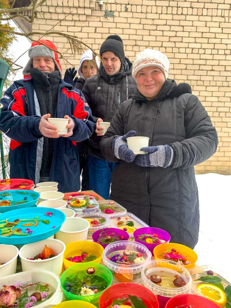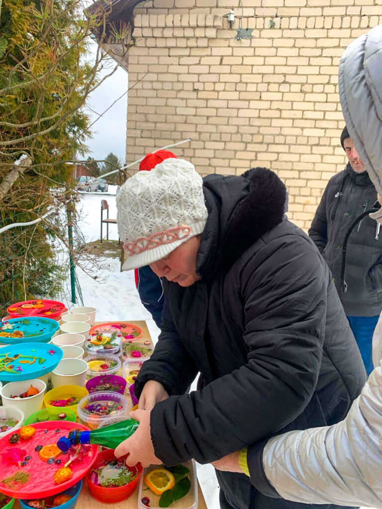 Šonedēļ filiālē “Mēmele” sals kļuva par īstu mākslas sabiedroto. Iedzīvotāji ar lielu azartu un interesi pildīja trauciņos ziedus, zarus un ogas, veidojot katrs savu unikālo kompozīciju. Tās aplēja ar ūdeni un nodeva ziemas, ziemiņas pārziņā, ļaujot salam paveikt savu burvību.