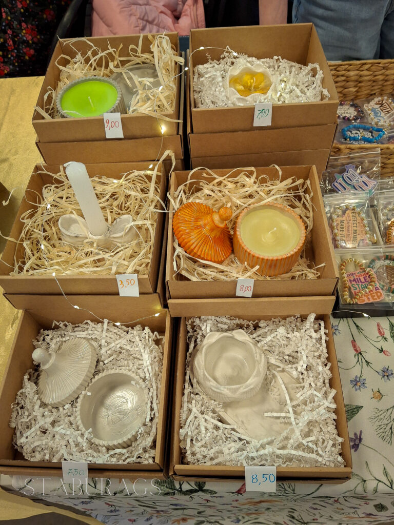 Ko gan jaunie uzņēmēji piedāvāja pircējiem? Piedāvājums tiešām bija interesants. Tā bija klasika — sveces, ziepes, rotaslietas, apdrukāti maisiņi, krēmi un ziedes. Taču bija arī kas neparastāks — piekabināmi jaku turētāji, rotaslietu organizatori, sejas maskas, kas pasargā apģērbu no dekoratīvās kosmētikas pēdām, proteīna batoniņi, enerģijas šotiņi, kuru sastāvā svaigi spiestas sulas, ar bišu vasku piesūcināti audumi, kurus var izmantot produktu iesaiņošanai, vadu organizators, otrreiz pārstrādāts papīrs, uzkodu mērcītes, vāciņš, kas nodrošinās dzērienu neizlīšanu no skārdenēm, pārveidots apģērbs, presēti tējzāļu kubiņi un daudzas citas lietas.