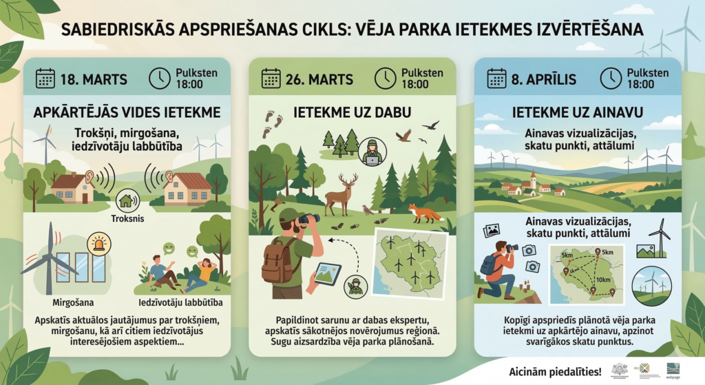 8. aprīlī pulksten 18 – ietekme uz ainavu. Kopīgi apspriedīs plānotā vēja parka ietekmi uz apkārtējo ainavu, apzinot svarīgākos skatu punktus un attālumus no turbīnām.