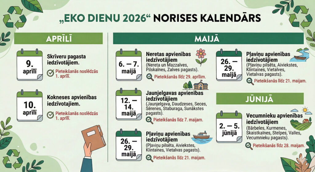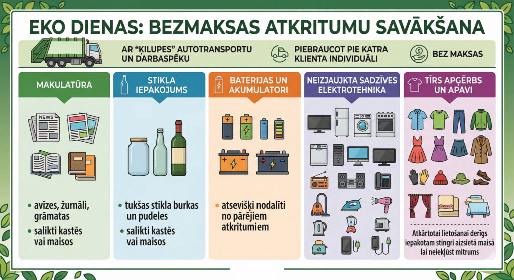 Atkritumu apsaimniekošanas uzņēmums SIA “Ķilupe” aicina privātmāju un dzīvokļu īpašniekus, uzņēmumus un pašvaldību iestādes bezmaksas atkritumu savākšanas akcijā “EKO Dienas 2026” ērti atbrīvoties no nolietotas elektrotehnikas, makulatūras, stikla iepakojuma, baterijām, akumulatoriem, kā arī nodot tīru, atkārtotai lietošanai derīgu apģērbu un apavus.