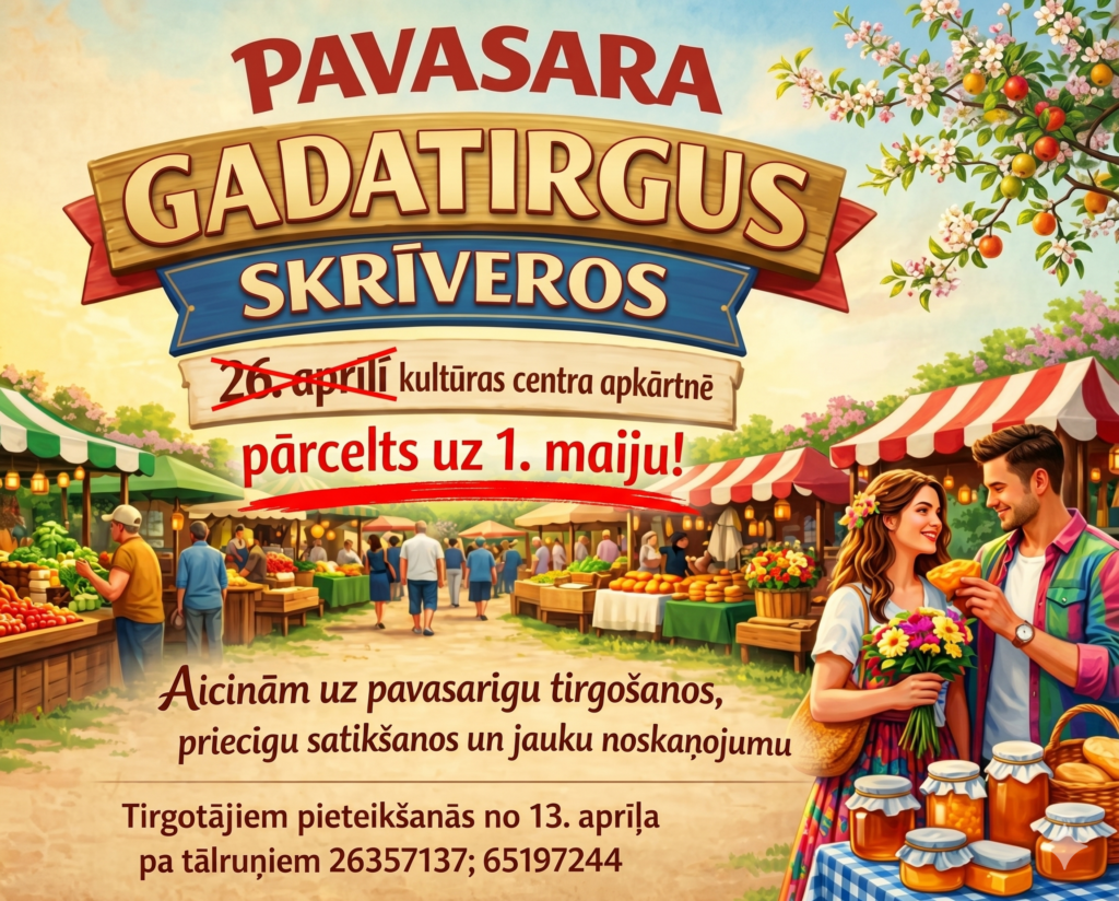 Skrīveros plānotais Pavasara gadatirgus, kas sākotnēji bija paredzēts 26. aprīlī kultūras centra apkārtnē, pārcelts uz 1. maiju. Organizatori aicina iedzīvotājus un viesus uz pavasarīgām tirgošanās iespējām, priecīgām satikšanām un jauku noskaņojumu.