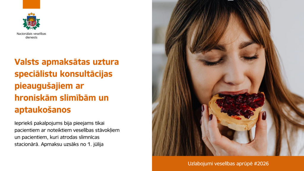 No 2026. gada 1. jūlija plānots uzsākt ambulatoru uztura speciālistu konsultāciju apmaksu pieaugušajiem pacientiem ar hroniskām slimībām un aptaukošanos. Iepriekš šāds valsts apmaksāts pakalpojums bija pieejams tikai pacientiem ar noteiktiem veselības stāvokļiem un pacientiem, kuri atrodas slimnīcas stacionārā.