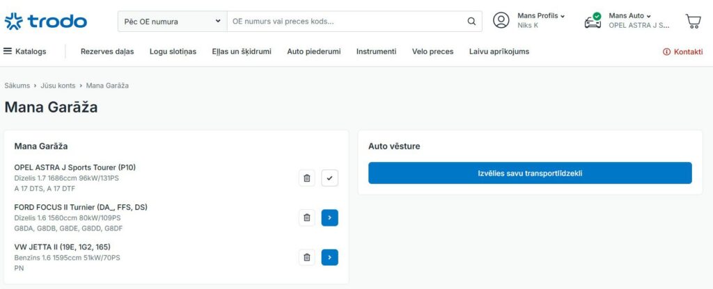Pievienojot automašīnu “Manai Garāžai”, visa detaļu atlase automātiski balstās uz saglabātajiem auto datiem. Tas ir īpaši noderīgi regulāras apkopes gadījumos vai situācijās, kad tiek pārvaldīti vairāki transportlīdzekļi. Šādi tiek samazināta nepieciešamība atkārtoti ievadīt informāciju un detaļu izvēle kļūst konsekventa un ērta katrā pasūtījumā.