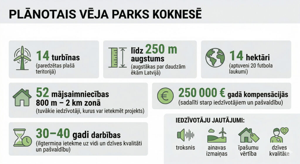 Kāpēc vēja turbīnas nevarētu izvietot vēl tālāk no tām 52 mājsaimniecībām, kas ir 800—2000 m attālumā no plānotā vēja parka? Tas jautājums palika neatbildēts.