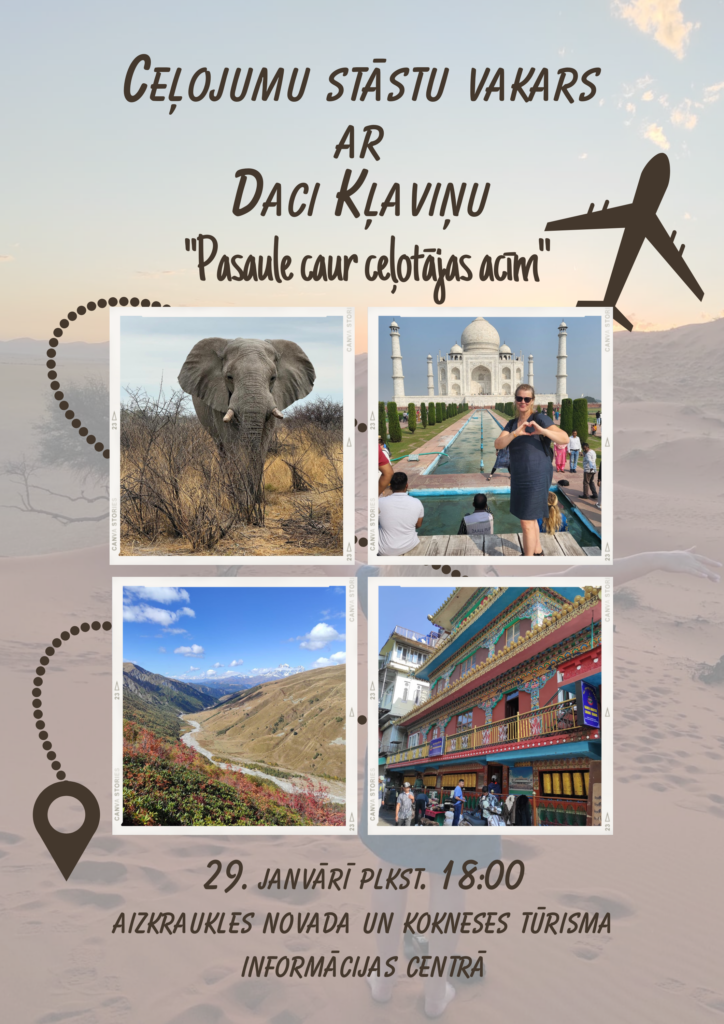 29. janvārī pulksten 18 Aizkraukles novada un Kokneses tūrisma informācijas centrā (1905.gada ielā 7, Koknesē)  notiks ceļojumu stāstu vakars “Pasaule caur ceļotājas acīm” kopā ar Daci Kļaviņu. Dace Kļaviņa dalīsies dažādu ceļojumu pieredzes stāstos un ikvienu klausītāju iedvesmos 2026.gadā ieplānot kādu tuvāku vai tālāku ceļojumu.