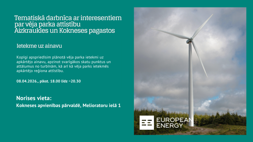 Šodien, 8. aprīlī, Koknesē notiks noslēdzošā tikšanās ar iedzīvotājiem par plānotā vēja parka attīstību Aizkraukles un Kokneses pagastos, kas ir daļa no iepriekš organizēto tematisko darbnīcu cikla. Pasākums norisināsies Kokneses apvienības pārvaldē, Melioratoru ielā 1, no pulksten 18.00 līdz aptuveni 20.30, un šoreiz uzmanības centrā būs vēja parka ietekme uz apkārtējo ainavu. Diskusijā plānots analizēt, kā turbīnas būs redzamas no dažādiem skatu punktiem, kā tās iekļausies reģiona vizuālajā vidē, kā arī kādi risinājumi un aktivitātes varētu palīdzēt vēja parku integrēt vietējā ainavā un identitātē. Tāpat paredzēts iepazīstināt ar iespējamu sadarbības ieceri ar Likteņdārzu, kas varētu veidot simbolisku un funkcionālu saikni starp infrastruktūras attīstību un kultūrvēsturisko vidi.