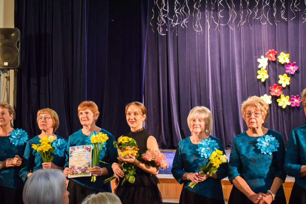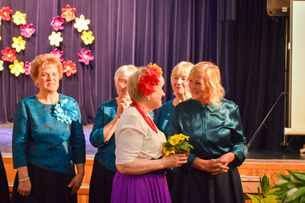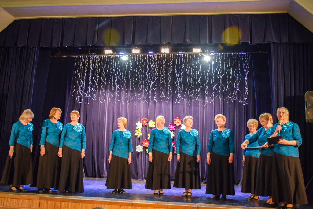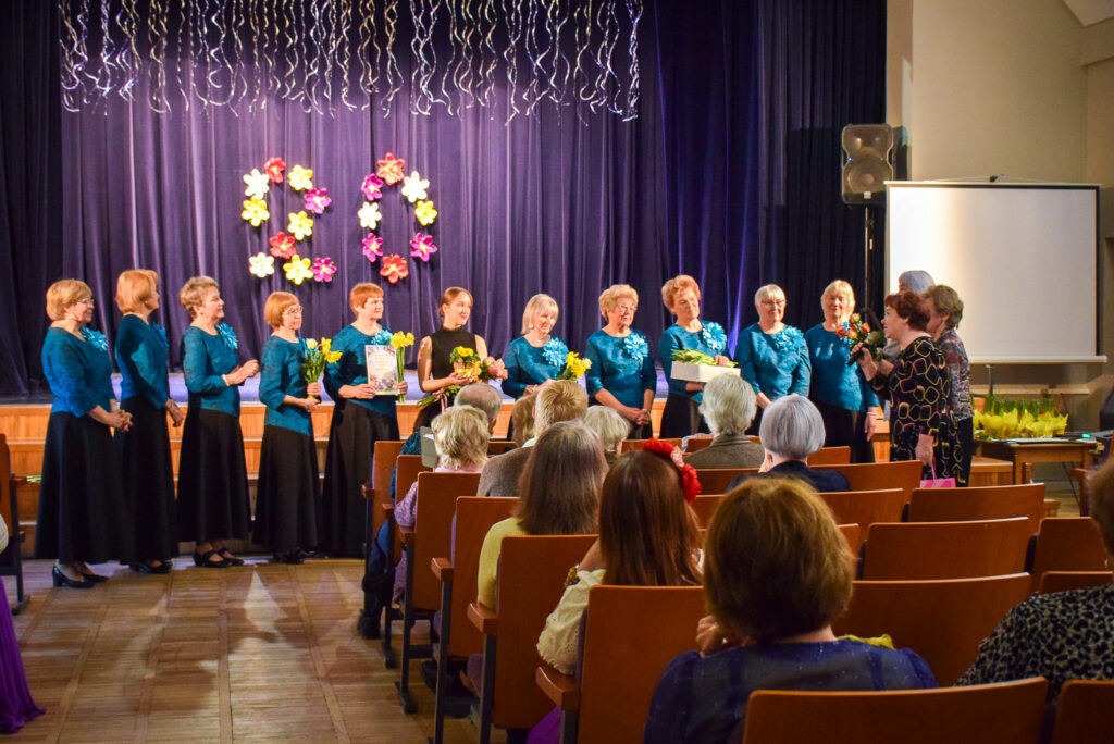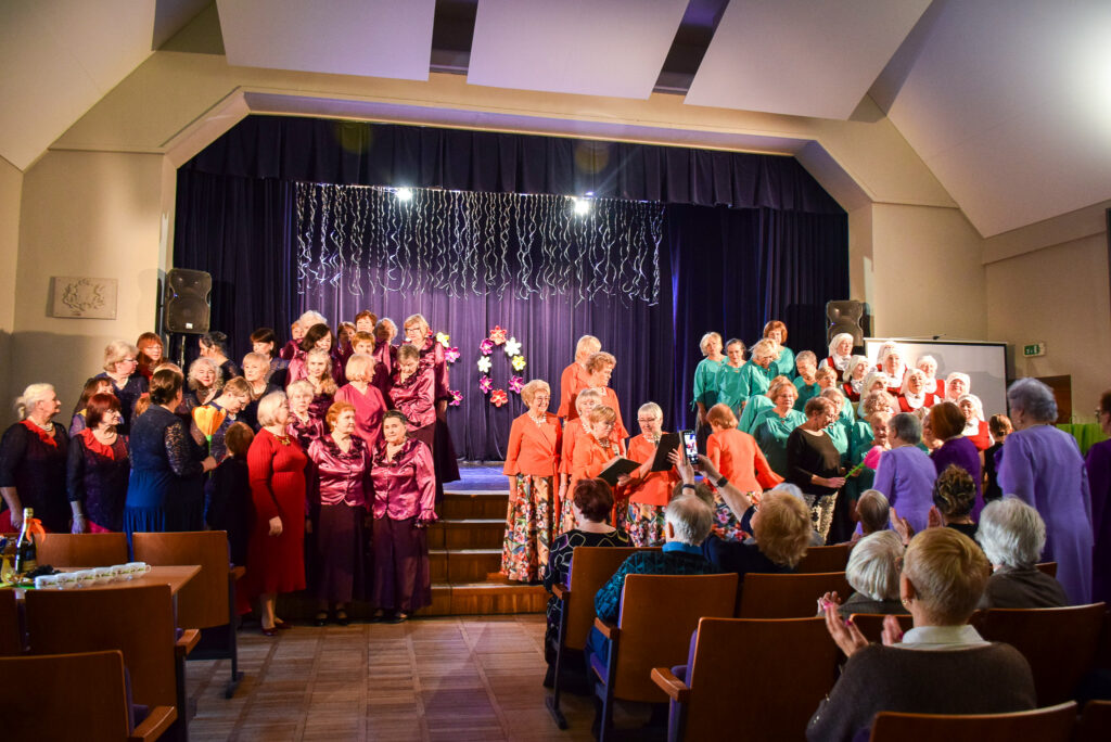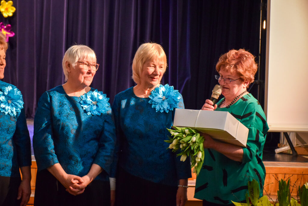 Kopā ar jubilārēm uz skatuves sanāca draugu kolektīvi — “Vīzija” no Jaunjelgavas, “Junda” no Kokneses, “Sniega roze” no Siguldas, “Vijas” no Ikšķiles, “Madara” no Salaspils, “Astras” no Ogres un “Vēlreiz” no Bauskas.