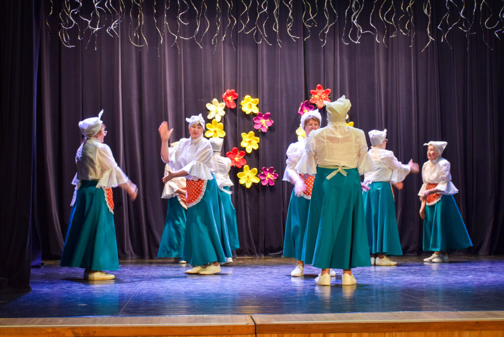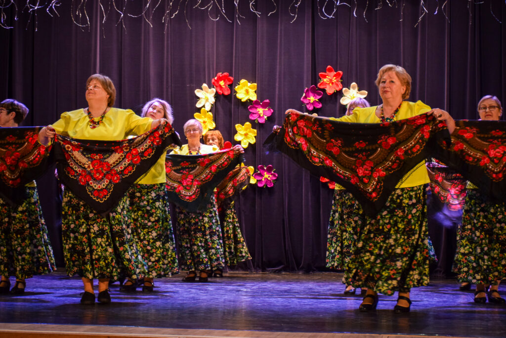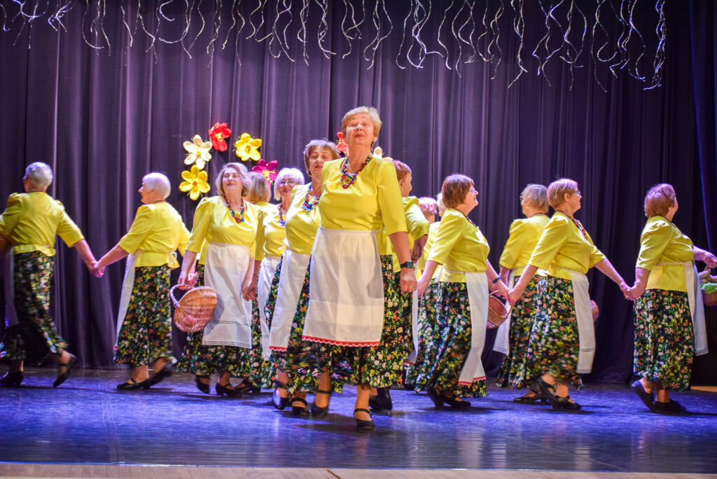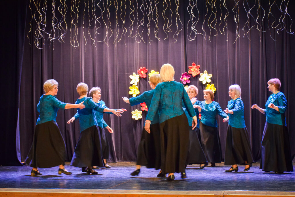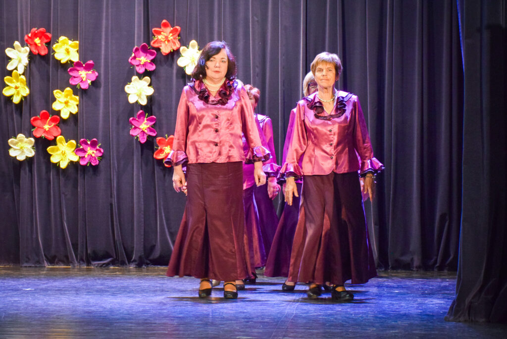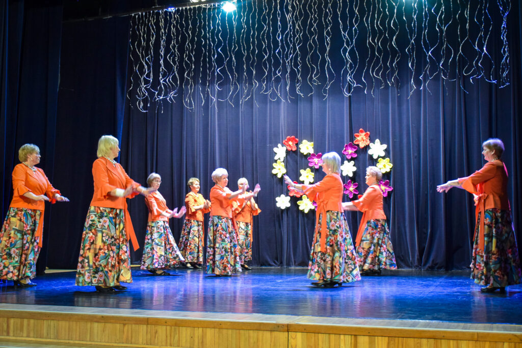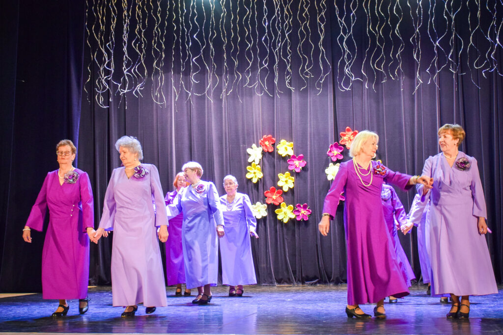 “Šodien visi ir krokusu krāsās — pavasarīgi, koši un dzīvības pilni. Cauri sniegiem laužas pirmie zaļumi kā dzirksteles pavasarī, kā cerīgs sapnis pēc ziemas, kā pavasara sirdspuksti. Tādas šodien ir “Aivas” dāmas,” savas dejotājas raksturoja kopas vadītāja Tatjana Petrovska.