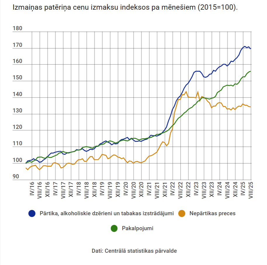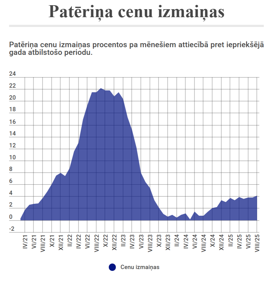 Finanšu ministrija norāda, ka inflācija Latvijā šogad pieaugusi un ir būtiski augstāka nekā vidēji eirozonā. 2025. gada augustā patēriņa cenas Latvijā bija par 4,1% lielākas nekā pirms gada, kas ir straujākais kāpums pēdējo divu gadu laikā. Vidēji gada pirmajos astoņos mēnešos inflācija Latvijā bija 3,7%, kamēr eirozonā – tikai 2,2%. Lielāka inflācija nekā Latvijā bijusi vien dažās valstīs – Igaunijā, Slovākijā un Horvātijā.