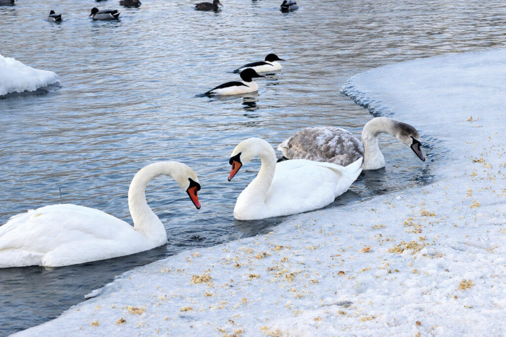 Ja cilvēki grib palīdzēt ūdensputniem, vispirms ir jāparūpējas, lai tiem būtu ūdens pleķis, kas nav pārvilcies ar ledu, jo ūdens temperatūra nekad nav zemāka par nulli. Šādā gadījumā, rūpējoties par putniem, nevajadzētu aizmirst par pašu drošību uz ledus. Tāpat putni tad regulāri jābaro ar auzu pārslām vai graudiem. Maize tiem nav veselīga un pilnvērtīga barība.