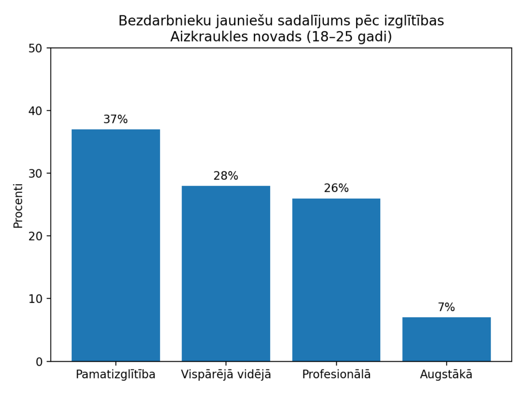 Nodarbinātības valsts aģentūras (NVA) reģistrā 2025. gada 31. decembrī Aizkraukles novadā bija 89 bezdarbnieka statusā NVA reģistrētie jaunieši vecumā no 18 līdz 25 gadiem. No tiem 46 bija sievietes (52 %) un 43 vīrieši (48 %). Sadalījumā pēc izglītības redzams, ka 37 % ir pamatizglītība, 28 % — vispārējā vidējā izglītība, 26 % — profesionālā izglītība, 7 % — augstākā izglītība. Tātad 65 % šo jauniešu ir tikai vidējā vai zemāka par vidējo izglītība, līdz ar to tas zināmā mērā apgrūtina viņu iespējas iesaistīties darba tirgū.
