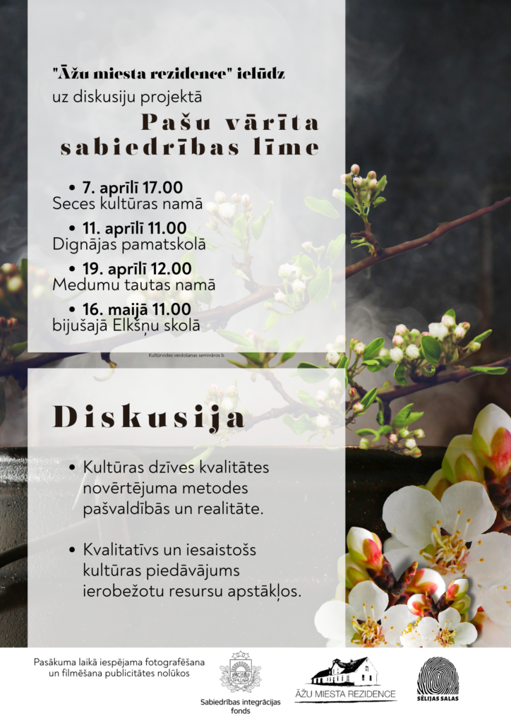 Aprīlī un maijā četrās Sēlijas kopienās – Secē, Dignājā, Medumos un Elkšņos – notiks kultūrvides veidošanas semināri. Biedrība “Āžu miesta rezidence” un kopienu sadarbības tīkls “Sēlijas salas” ielūdz Jūs piedalīties diskusijā par kultūras piedāvājumu laukos. Diskusijā runāsim par šādām tēmām: