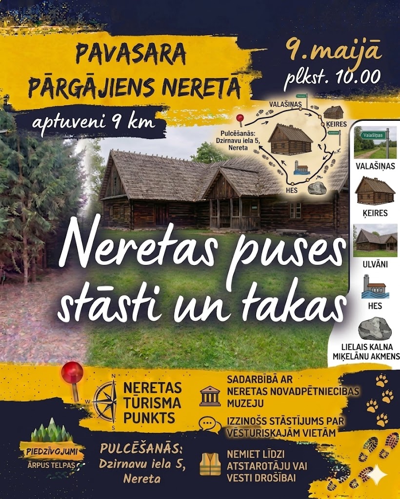 9. maijā Neretā notiks pavasara pārgājiens “Neretas puses stāsti un takas”, kurā interesenti aicināti doties aptuveni deviņus kilometrus garā maršrutā, iepazīstot apkārtnes vēsturiskās un dabas vērtības.