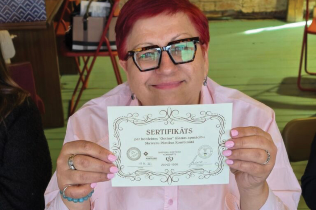Viena no interesantām pieredzēm, ko šajā tikšanās reizē piedzīvojām, ir Skrīveru pārtikas kombināta apmeklējums. Vēsturiskajā ēkā, kur kādreiz bija uzņēmuma ēdnīca, bet tagad iekārtota tirdzniecības zāle ar daudzviet izstādītām interesantām un apskatāmām vēsturiskām liecībām, notiek gides Ineses Paegles vadītā darbnīca, kurā ikvienam pēc iespējas ātrāk jāiemācās divos papīrīšos ietīt lipīgo konfekšu masu. Uzzinājām, ka pašlaik uzņēmumā strādā astoņas konfekšu tinējas. Prasmīgākās iemanījušās dienā ietīt 100 kilogramu konfekšu, vienai konfektei veltot vien trīs sekundes. Vidēji katra strādniece dienā ietin 80 kilogramu konfekšu. Zināšanai — vienā kilogramā ir 58 konfektes. Ja godīgi, šis amats nemaz nav viegls, jo mums ar to ietīšanu gāja kā pa kalniem un lejām. Toties beigās visi saņēmām īpašu, uzņēmuma īpašnieka Aigara Lūša parakstītu sertifikātu par konfektes “Gotiņa” tīšanas apmācību. Ieraugot plašo ražoto “Gotiņu” klāstu, godavārds, gribējās iegādāties visas pēc kārtas. Tomēr, nogaršojot dīvaināko konfekti ar aukstās zupas garšu, daudzi kļuva domīgi un asociācijas bija dažādas, dažs teica, ka tā atgādina aukstajā zupā iemestu saldo “Gotiņu”. Gide I. Paegle atklāja, ka šī konfekte radīta īpaši lietuviešiem. Viņi lielās, ka viņu nacionālais ēdiens esot slavenā rozā aukstā zupa ar marinētajām bietēm. Šis strīds, kuram pieder aukstās zupas atklājēja gods, velkas gadiem, un skrīverieši necenšas strīdēties, bet radījuši augstās zupas “Gotiņu”. Lietuviešiem patīkot.