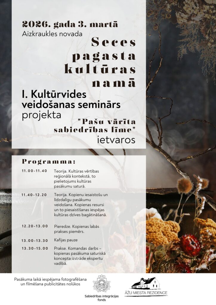 Dalība kultūrvides veidošanas semināros bez maksas. Seminārus rīko biedrība “Āžu miesta rezidence” projekta “Pašu vārīta sabiedrības līme” ietvaros. To norisi finansiāli atbalsta Sabiedrības integrācijas fonds no Latvijas valsts budžeta līdzekļiem.