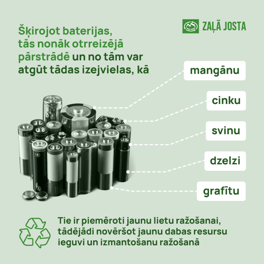 “Bateriju sastāvā ir skābes, sārmi, svins, kadmijs, dzīvsudrabs un citas vielas, kas, nonākot dabā, var radīt neatgriezenisku kaitējumu videi un cilvēka veselībai,” skaidro “Zaļās jostas” vides izglītības eksperte Ieva Erta.