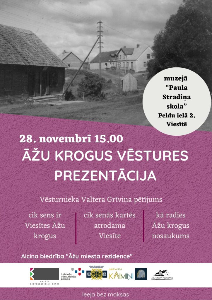 Publicēts līdz šim apjomīgākais vēstures pētījums par Āžu krogu Viesītē, ko veicis viens no zinošākajiem krogus pētniekiem Latvijā Valters Grīviņš. Pētījuma prezentācija notiks Viesītes muzejā “Paula Stradiņa skola” 28. novembrī pulksten 15.00.