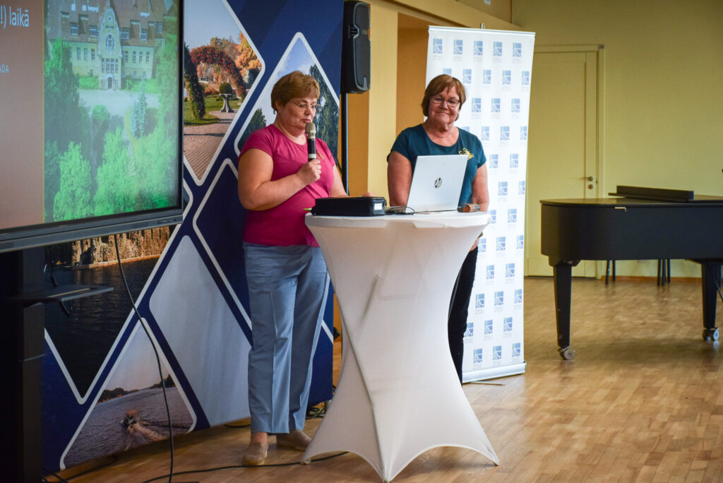 AIZKRAUKLES NOVADA IEDZĪVOTĀJU SABIEDRĪBAS LĪDZDALĪBAS FORUMĀ, kas pulcēja kopienu līderus, nevalstiskās organizācijas, pašvaldības pārstāvjus un iedzīvotājus, savā pieredzes stāstā par kopienas izveidi dalījās Ieva Klauža (no kreisās) un Sarmīte Plūme, Bebru pagasta biedrības “Bites” pārstāves.